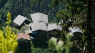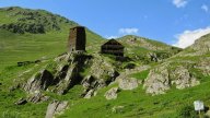 Здания в Тушети строились из местного сланца, который добывали тут же, рядом со строящимся зданием. Причем, из сланцевых плит сделаны не только стены, но крыши домов и башен. Поэтому, глядя на деревни из этих домов и башен, остается чувство, что их не построили, а они выросли из этих скал. Часто, даже при внимательном осмотре, трудно понять, где кончается скала и начинаются стены. Что удивительно, эти башни, сложены без какого-либо вяжущего материала, просто за счет точного подбора плит и их собственного веса. Еще удивительнее, что высота этих изящных сооружении достигает высоты 8 этажного дома, и стоят они много сотен лет в достаточно сейсмоопасной зоне. Есть башни, в которых устроены семейные гостиницы. Вверх по подвешенной к стене лестнице и вы в своем гостиничном номере. Большая вывеска «HOTEL» не даст спутать такую башню с просто башней.